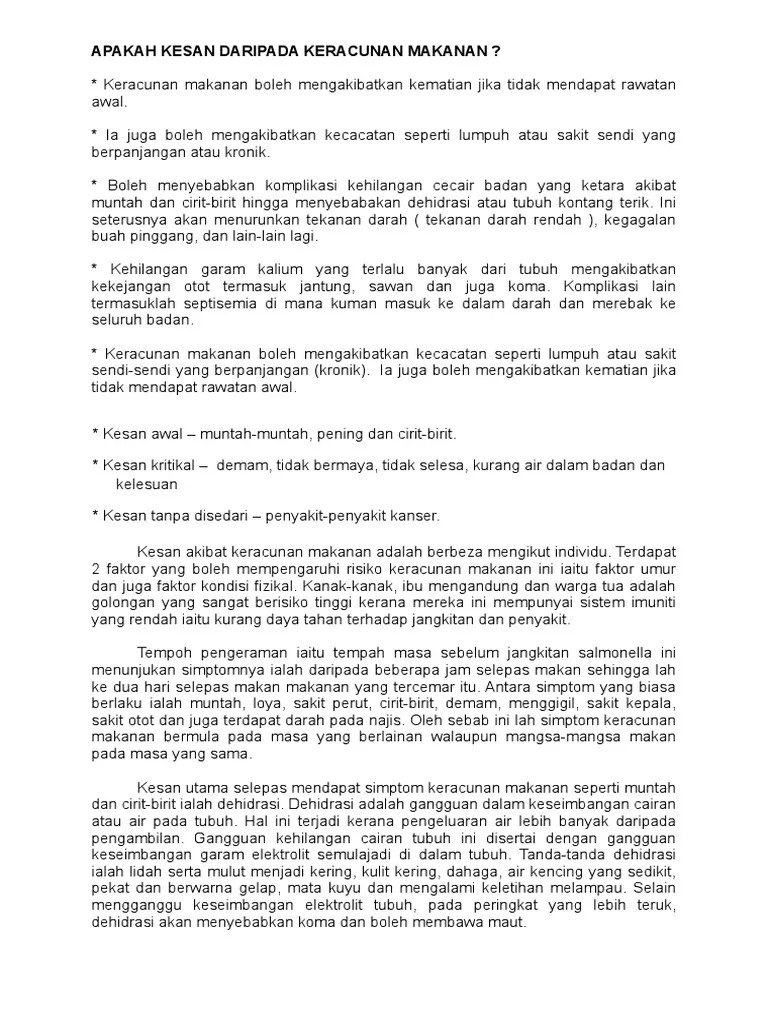 Penyediaan makanan secara tidak bersih akan menyebabkan kes keracunan makanan berlaku. Contoh karangan stpm/spm untuk para pelajar . Karangan percubaan stpm negeri negeri 2011. Sebanyak 11,226 kes keracunan makanan berlaku di sekolah di seluruh negara dari januari sehingga 15 september lalu berbanding 5,613 kes pada . Secara tuntas, terdapat tujuh kelas makanan, iaitu karbohidrat, protein, lemak, vitamin dan garam mineral, pelawas dan air. Apakah punca keracunan makanan dan bagaimana masalah ini boleh . Kejadiaan keracunan makanan yang menyebabkan penyakit semakin meningkat secara drastik. Di samping itu, keadaan persekitaran kantin yang kotor menjadi punca . Jika dilihat secara terperinci dalam isu ini, kita dapat memahami bahawa terdapat banyak punca yang menyambung kepada keracunan makanan .