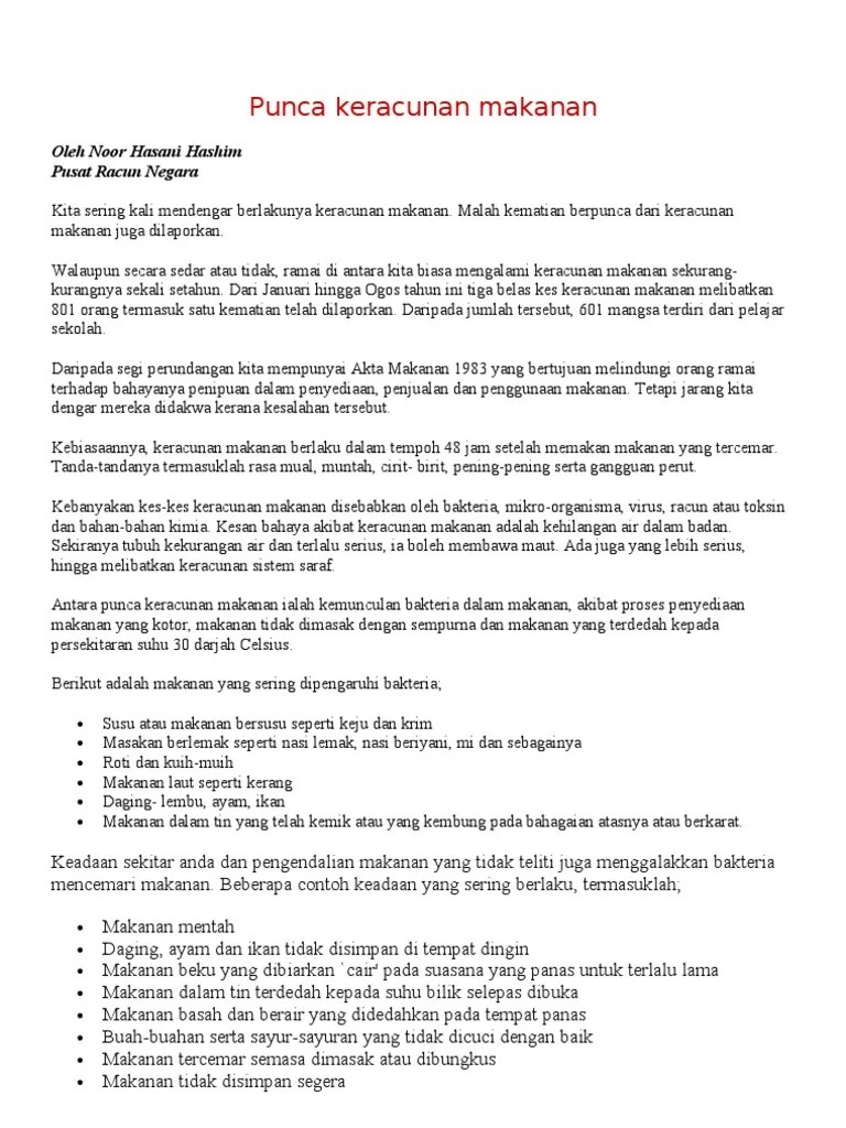 Apakah punca keracunan makanan dan bagaimana masalah ini boleh karangan punca keracunan makanan. Sebanyak 11,226 kes keracunan makanan berlaku di sekolah di seluruh negara dari januari sehingga 15 september lalu berbanding 5,613 kes pada .